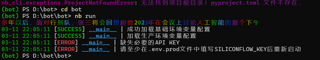 .env.prod这个文件。把你刚才复制的API KEY填入到SILICONFLOW_KEY=这个等号的右边。在默认情况下,Aibot使用的默认Api都是硅基流动的。